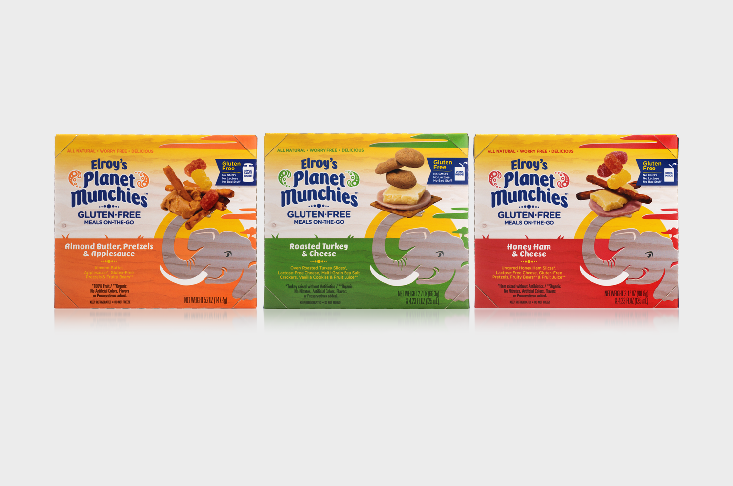 Elroy’s Planet Munchies bring gluten-free, all-natural meal kits to kid lunches in a fun experience. By only providing allergy free products for sensitive diets, Elroy’s is the worry-free and smart choice for parents. Elroy, is the name of our client’s father who was the strong and wise leader of the family. We decided to pay homage to this important figure in her life and embody his spirit as Elroy the elephant. With games and trivia inside as a pull out game sheet, we wanted the meal-kit to be fun to eat and interact with.